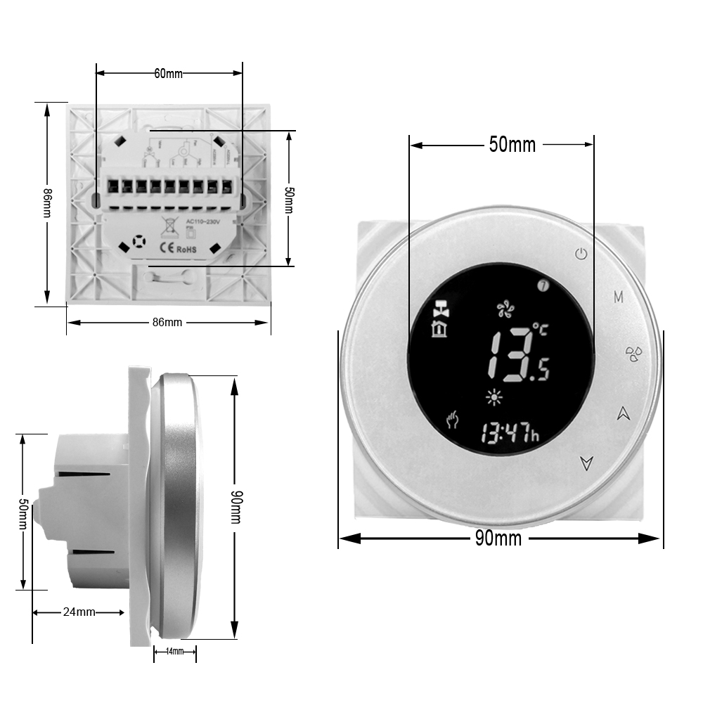 应用:二管制/四管制风机盘管系统温度调节 输入电压:110-230VAC; 24VAC 使用环境:0-45℃, 5-95%RH 制冷/制热/送风模式可选 三档风速可调 手动/5+2 六周期可编程控制 支持APP远程控制,语音控制 远程控制:MODBUS/WIFI 可选